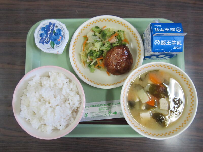 ごはん わかめのみそ汁 チーズインハンバーグ ビタンミンAたっぷりサラダ ブルーベリーセリーです。おいしくいただきました