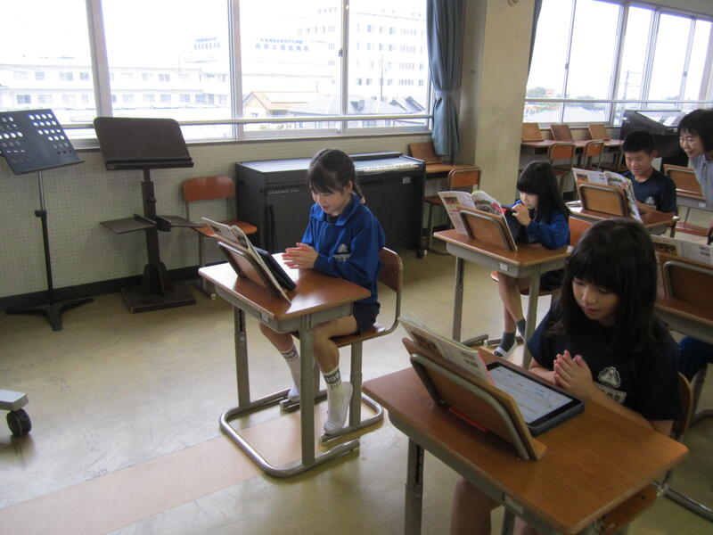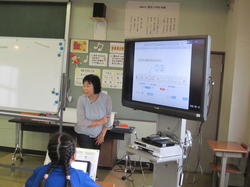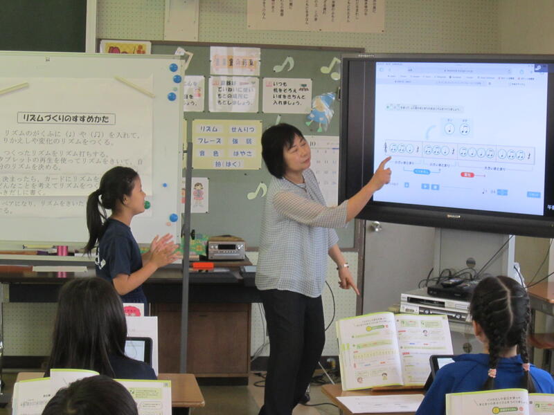3校時に、3年生の音楽の授業研究を行いました。今日は四分音符と八分音符、そして四分休符を使って「繰り返しや変化を使ってリズムを作る」学習です。リズムを作るためのとっておきの秘密兵器は「タブレット」。教科書のQRコードを読み取りデジタルコンテンツを開くと、音符や休符を指定の箇所に入れるだけで、リズムを作り、どのようなリズムになったのかを実際に聞くことができます。操作も非常に簡単なため、子どもたちはとても意欲的にリズムづくりに取り組んでいました。そして、実際に聞いて確かめながら全員が自分だけのリズムを作ることができました。今回の学習内容には、タブレットの活用が大変有効である事が確認され、実のある授業でした。