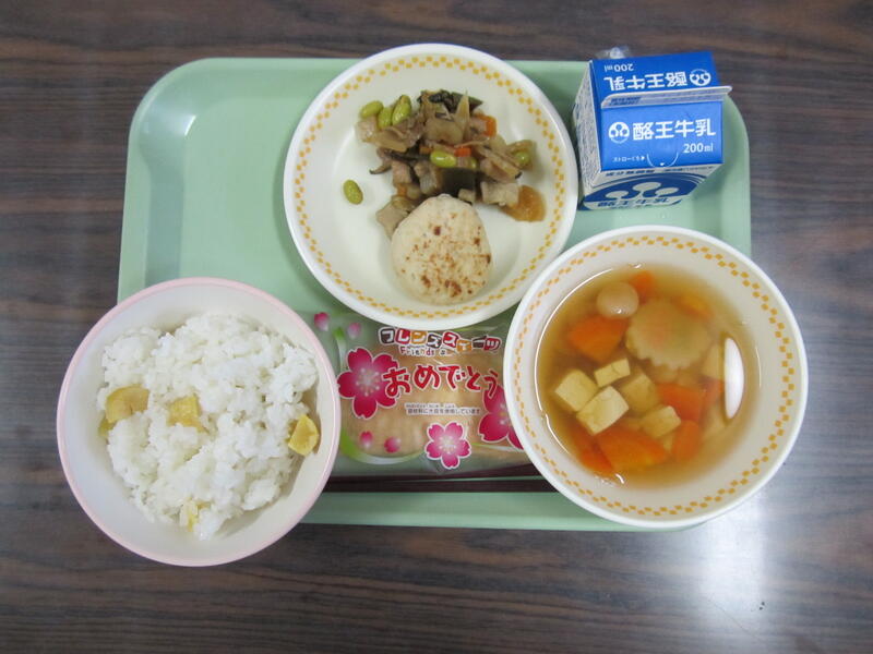 栗ごはん あさり入りすまし汁 きんぴら包み焼き 煮しめ お祝いクレープ です。おいしくいただきました