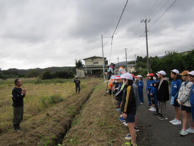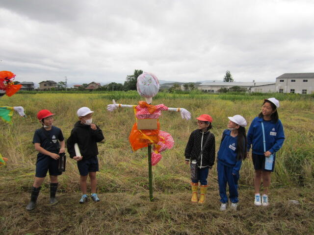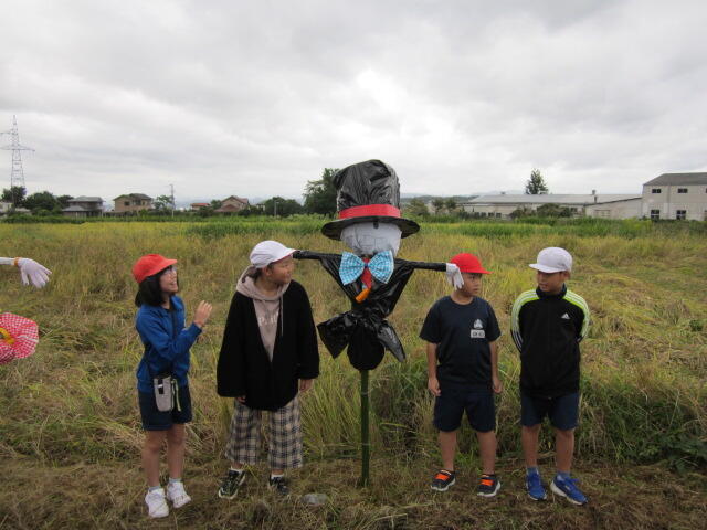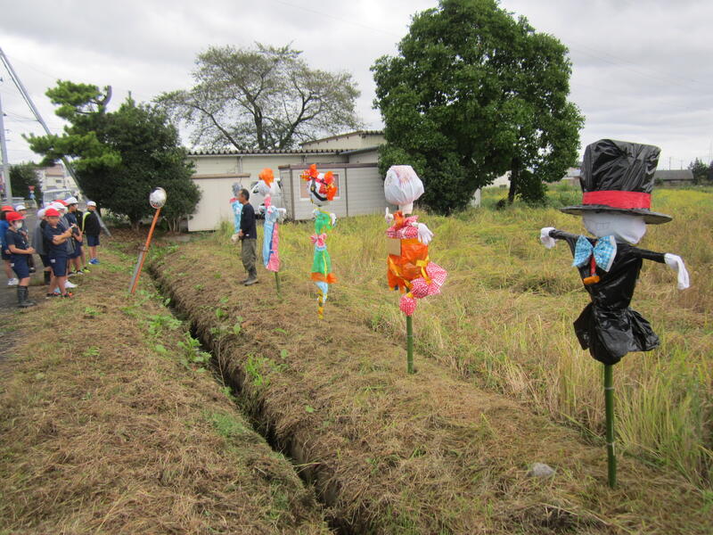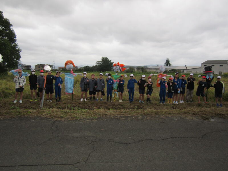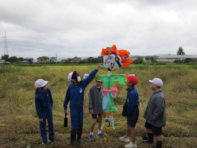 2024年10月10日 16時46分雨で延期になっていた田んぼの「かかし立て」を、今日やっと行うことができました。今年も、5年生の子どもたちは個性的な「かかし」を作り、みんなで田んぼに立てました。カラフルな色使いで、とっても映えます。これで鳥からお米を守り、無事に収穫ができるといいですね。