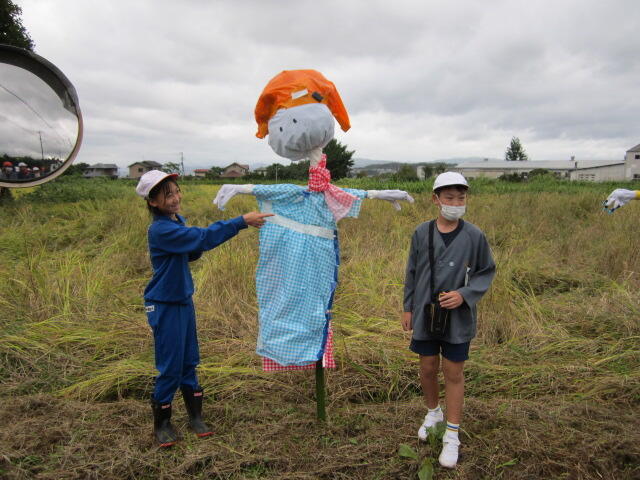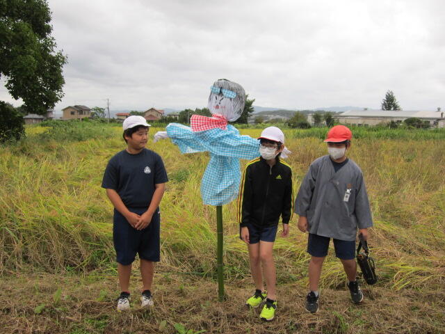 雨で延期になっていた田んぼの「かかし立て」を、今日やっと行うことができました。今年も、5年生の子どもたちは個性的な「かかし」を作り、みんなで田んぼに立てました。カラフルな色使いで、とっても映えます。これで鳥からお米を守り、無事に収穫ができるといいですね。