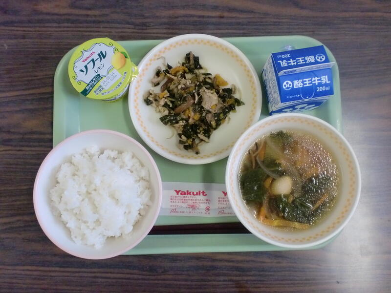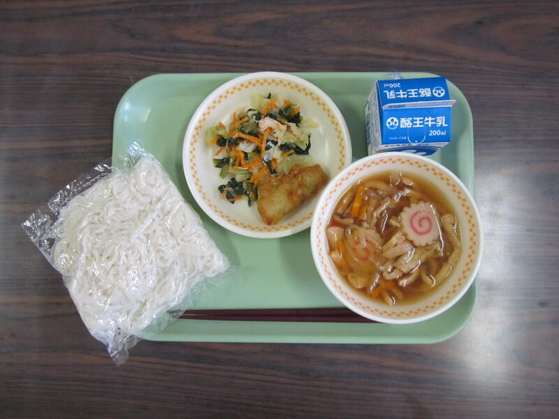 ソフトめん きつねうどんかけ汁 あじフリッター 小松菜のサラダ です。ごちそうさまでした
