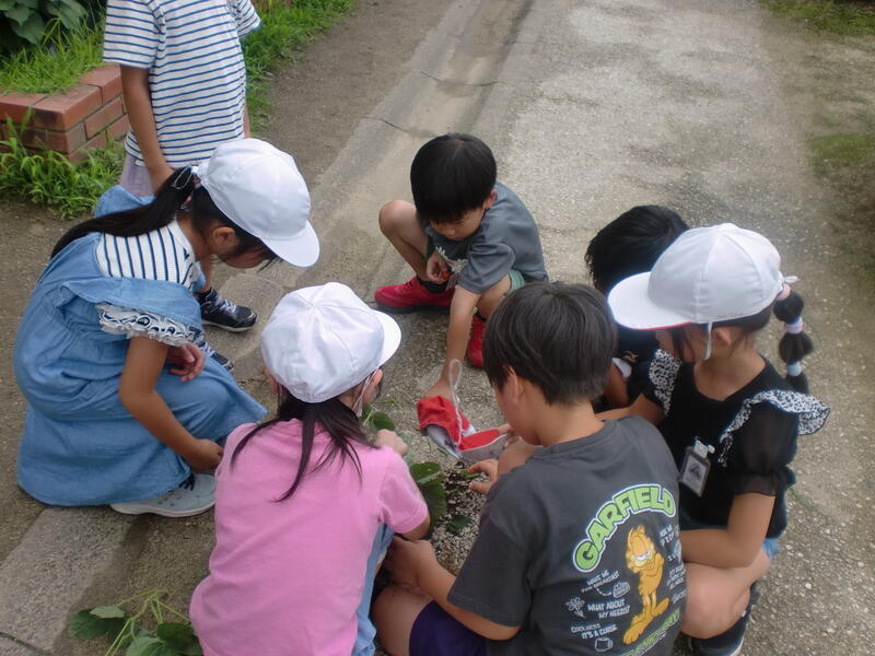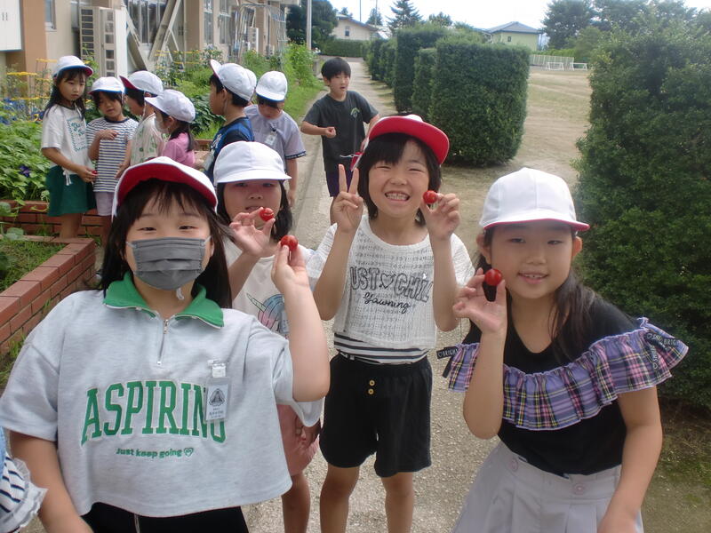 2年生の子どもたちが5月に植えた野菜もぐんぐん育ちました。今日は学校の花壇で育てたミニトマトと枝豆の収穫です。