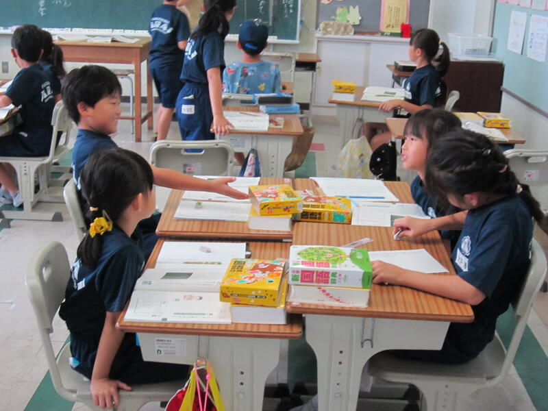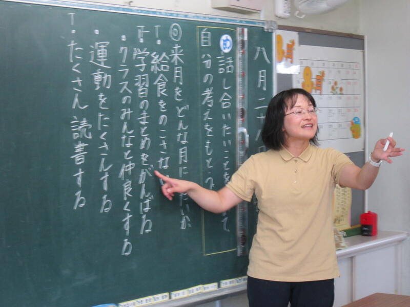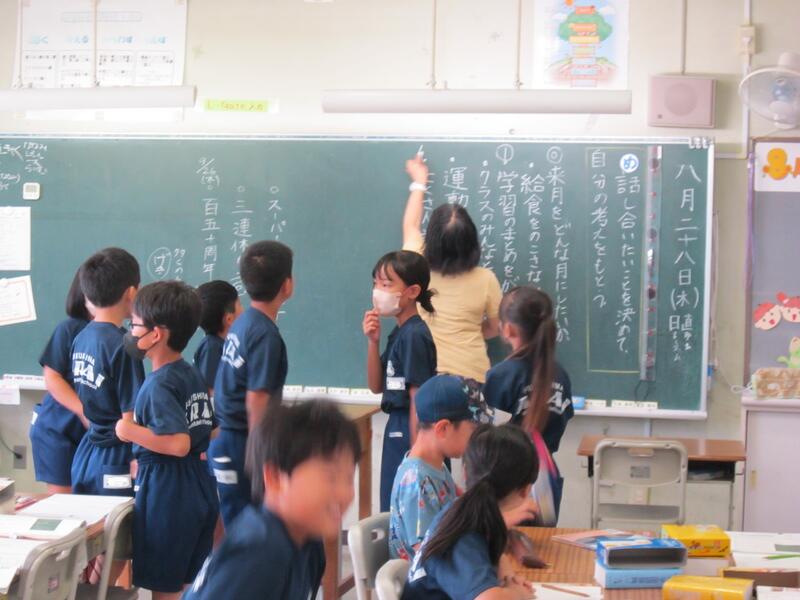 3年生の国語の学習は「グループの合い言葉を決めよう」です。まずグループごとに「9月をどんな月にしたいか」を選び、「それを達成できるようにするための合い言葉」を決めていきます。自分の考えをもち、それをグループで意見交換し合い一つの意見にまとめる。他の教科にも必要な力ですね。
