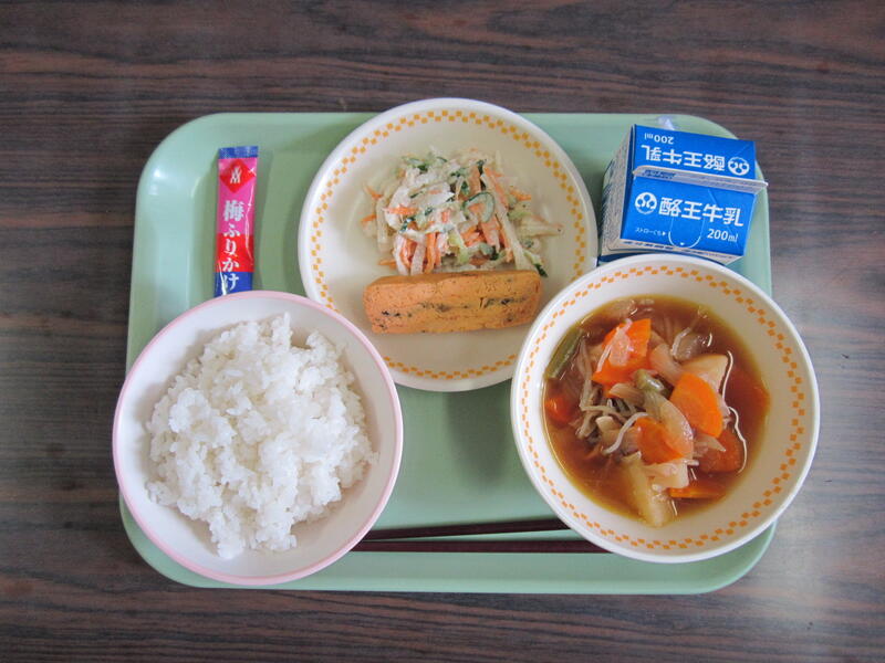 ごはん 梅しそふりかけ 肉じゃが 五目卵焼き ホタテサラダ です。おいしくいただきました