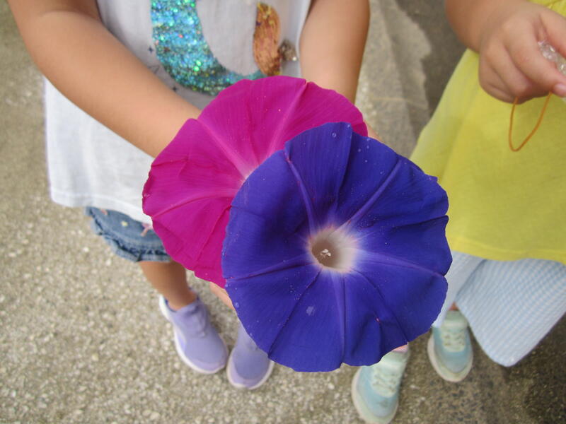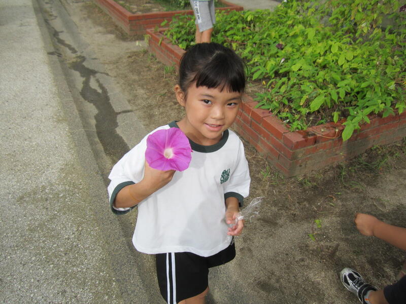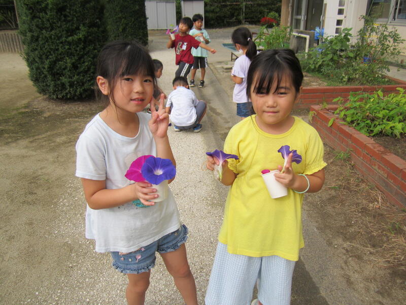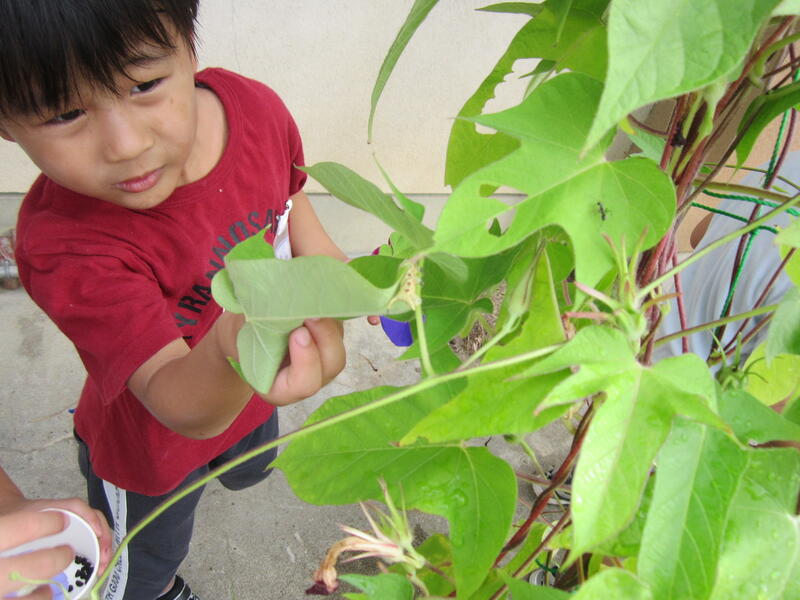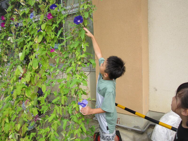 1年生。1学期から育ててきたアサガオの花と種を採っています。