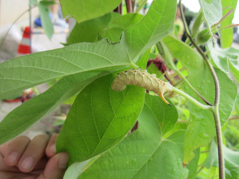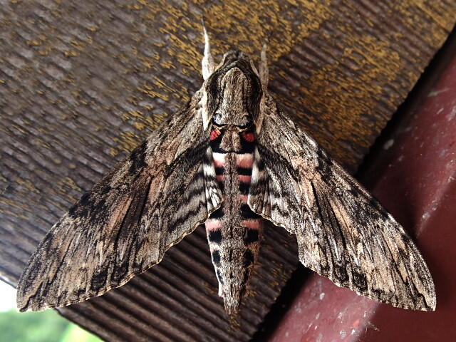 調べてみると、「エビガラスズメ」という蛾の幼虫だそうです成虫はこんな感じになります。