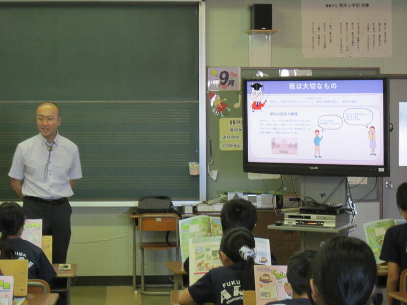 2024年9月2日 15時58分6年生の社会科は、法人会の担当の方が本校においでになり、「租税教室」が開かれました。自分たちが納めている「税金」の目的、使われ方、もし税金がなければどうなるか等、アニメやパワーポイントの資料で説明を受けました。その他にも、1億円のレプリカを持ってその重さを感じたり、世界の面白い税金についてクイズ形式で答えたりと、税金についてより理解を深めることができました。