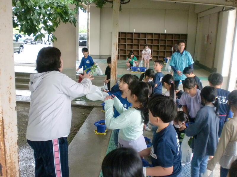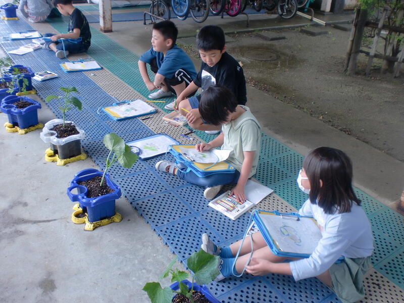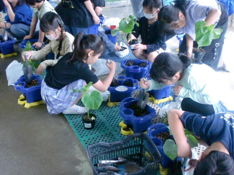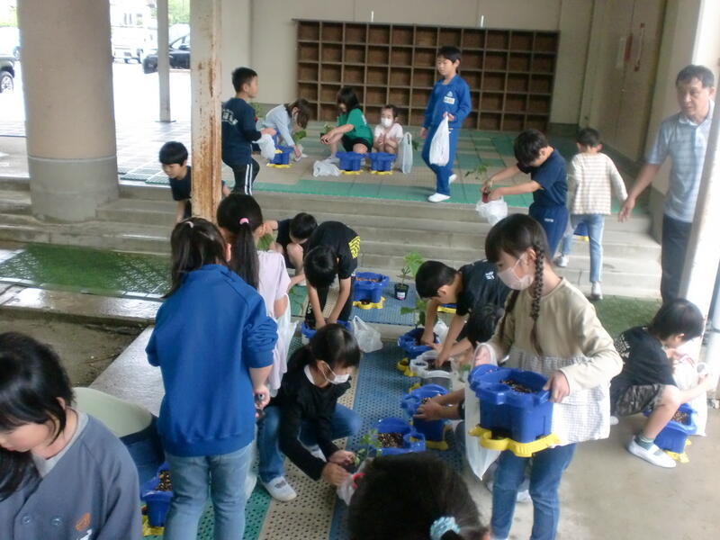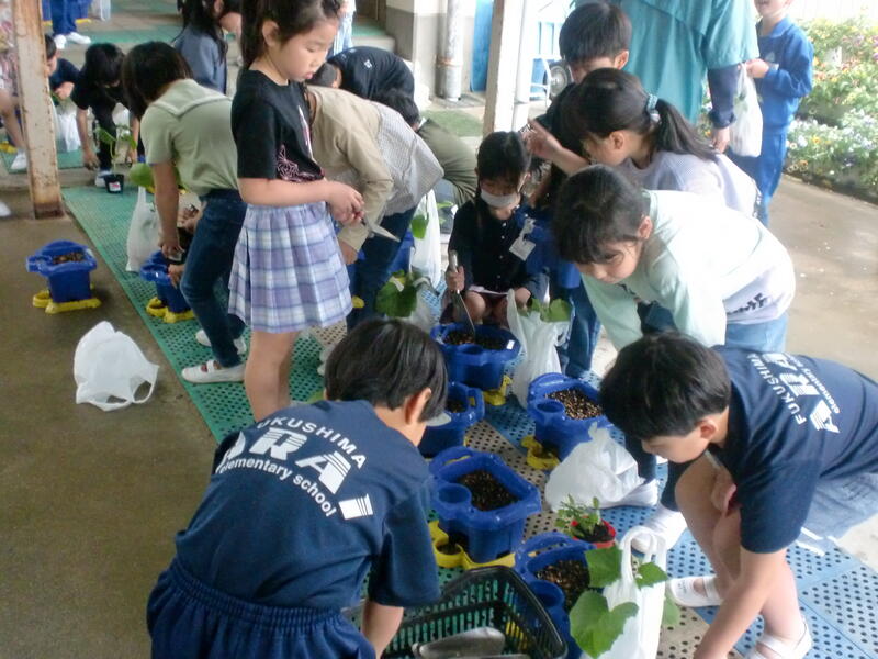 2年生の生活科では「野菜を育てよう」の活動を行います。今日は、道路向かいの「JAここら西店」からミニトマトやキュウリなど、子どもたちが選んだ野菜の苗を買い、それぞれの植木鉢に植えました。これから子どもたちは水やりなどのお世話をして育てます。大きくなるのが楽しみですね。