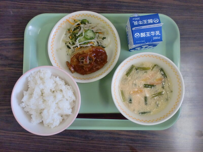 ごはん にらたま汁 ハンバーグきのこソース 野沢菜あえ です。おいしくいただきました