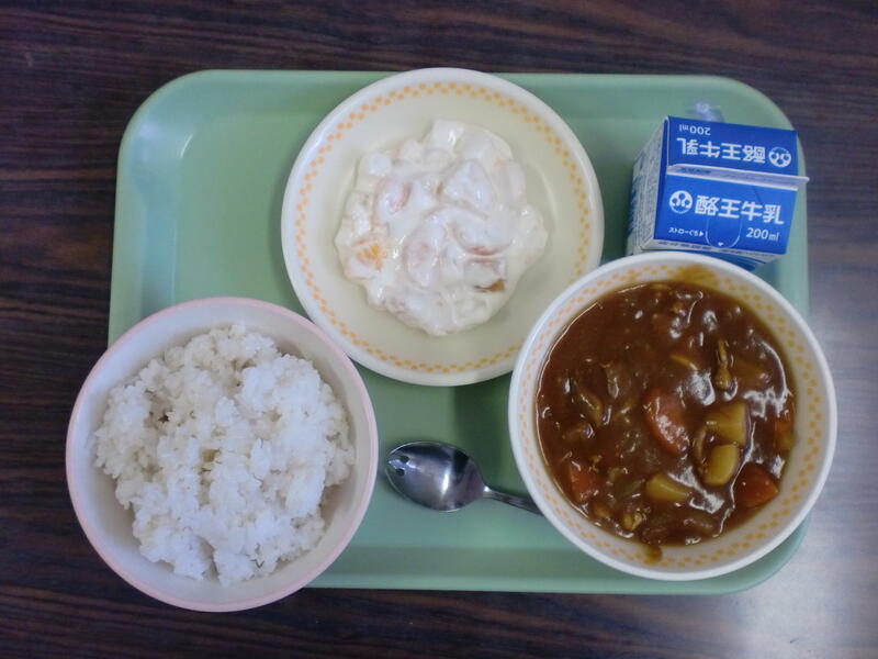 麦ごはん ポークカレー フルーツヨーグルト です。急に暑くなりました。フルーツヨーグルトがとってもさわやかでおいしかったですね。ごちそうさまでした。