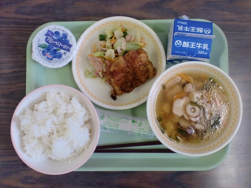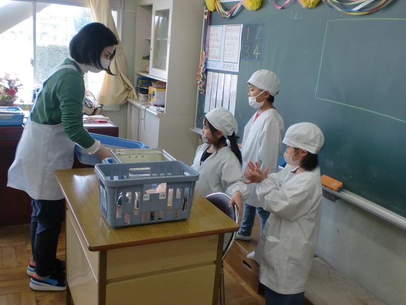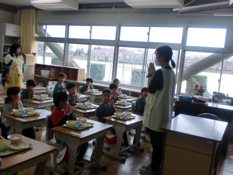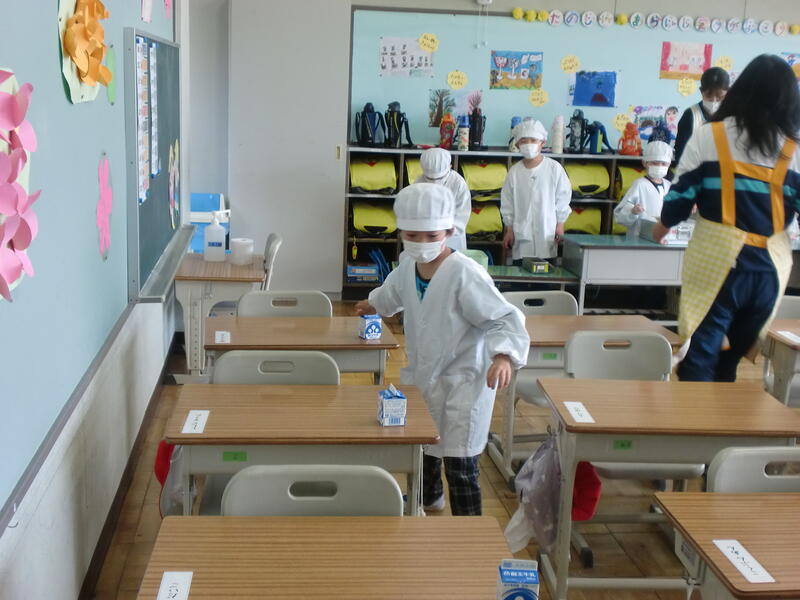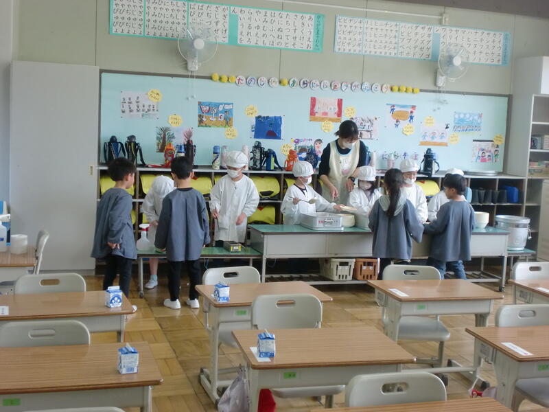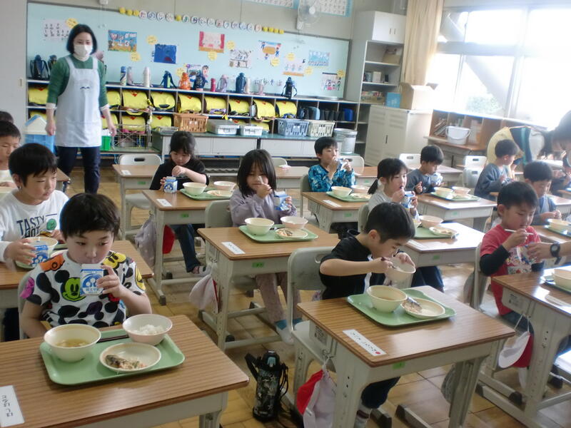 今日から1年生も給食を食べます。先生から、準備・後片付けの仕方や食べ方を教えてもらい、お手伝いの先生と一緒に上手に準備ができました。今日はお魚料理。「おいしい!」と言ってしっかり食べることができました。みんなすごいね!