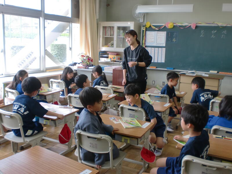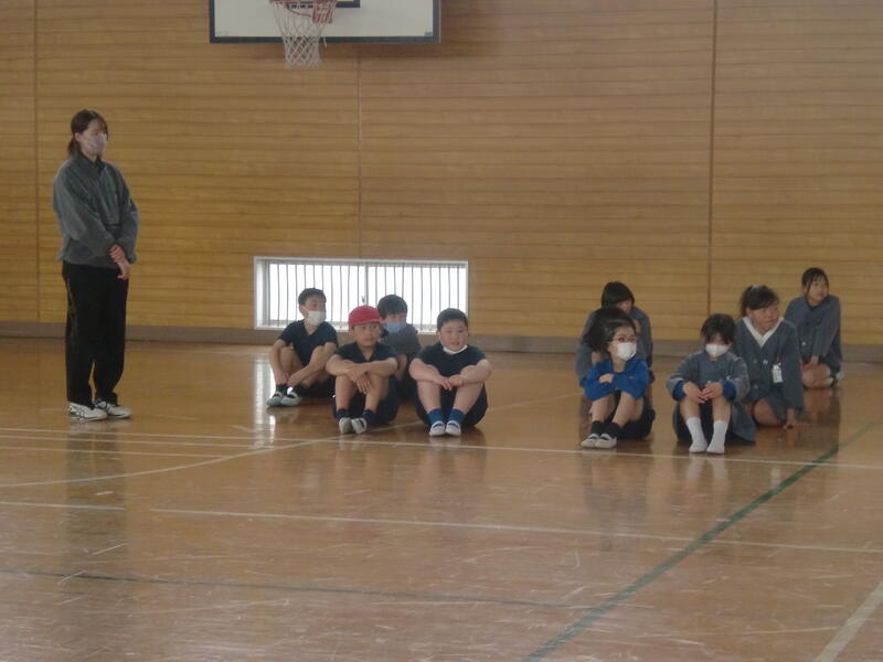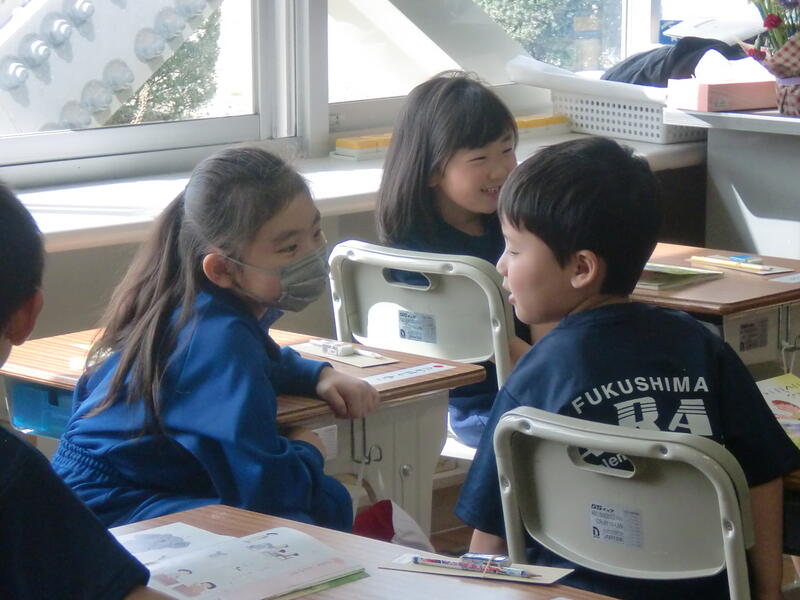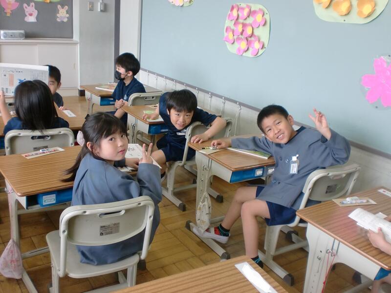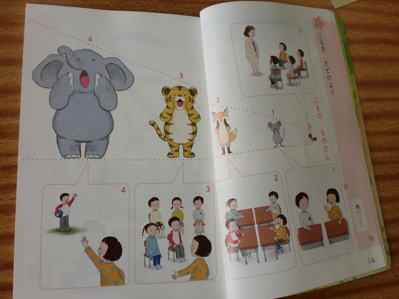 1年生は「こえのものさし」のお勉強。「ねずみさんの声」「きつねさんの声」「とらさんの声」「ぞうさんの声」の4つの大きさを、お隣さん同士で確かめ合いました。