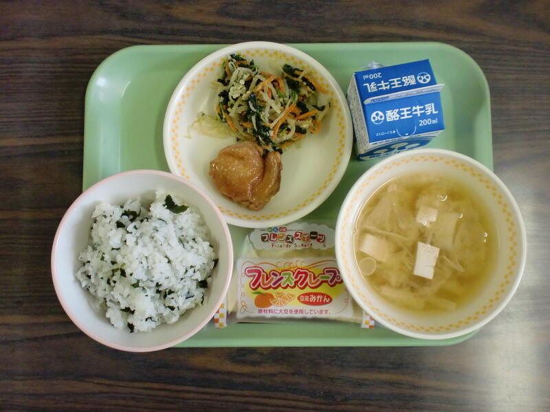 わかめご飯 ジャガイモのみそ汁 鶏の照り焼き アーモンドあえ みかんクレープ です。