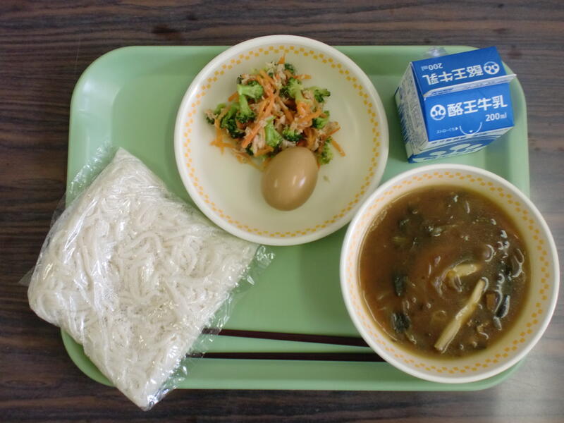 ソフトめん カレー南蛮かけ汁 味付き煮玉子 ビタミンAたっぷりサラダ です。おいしくいただきました