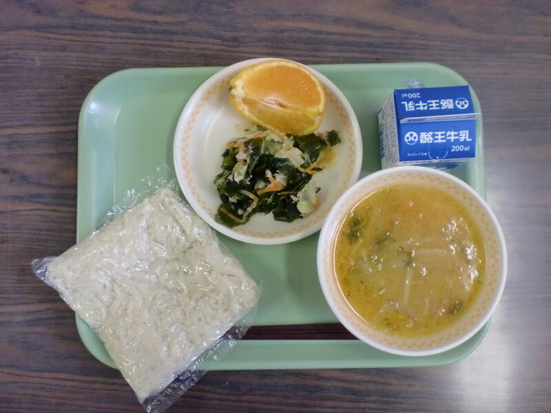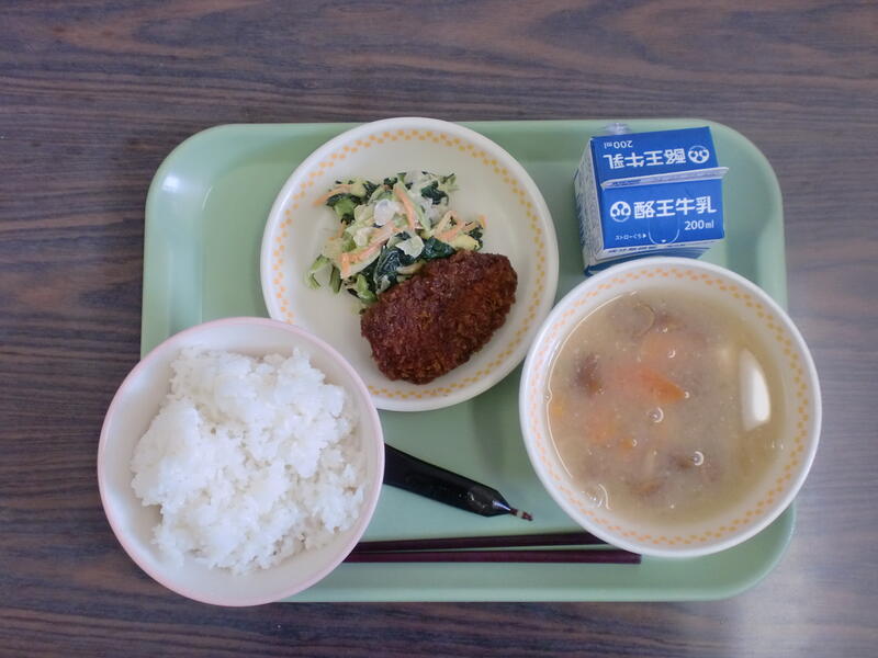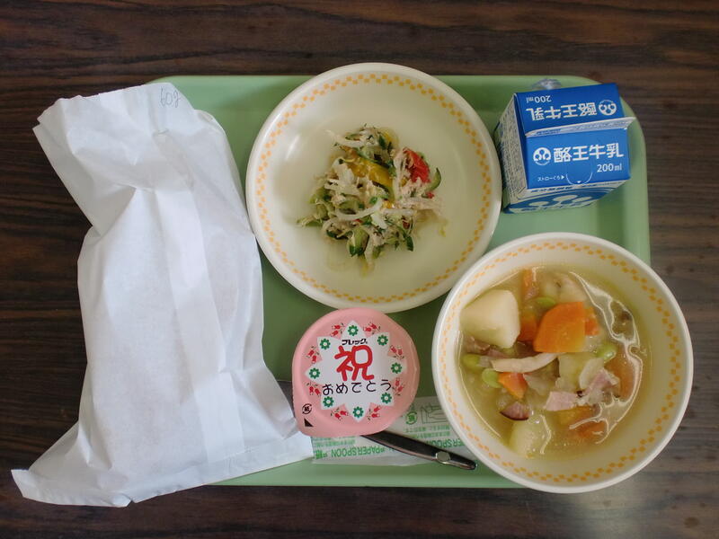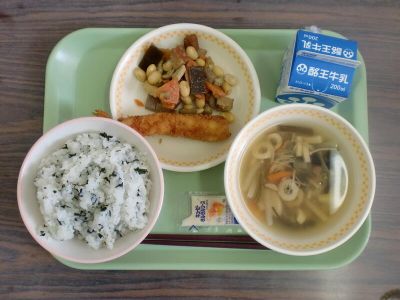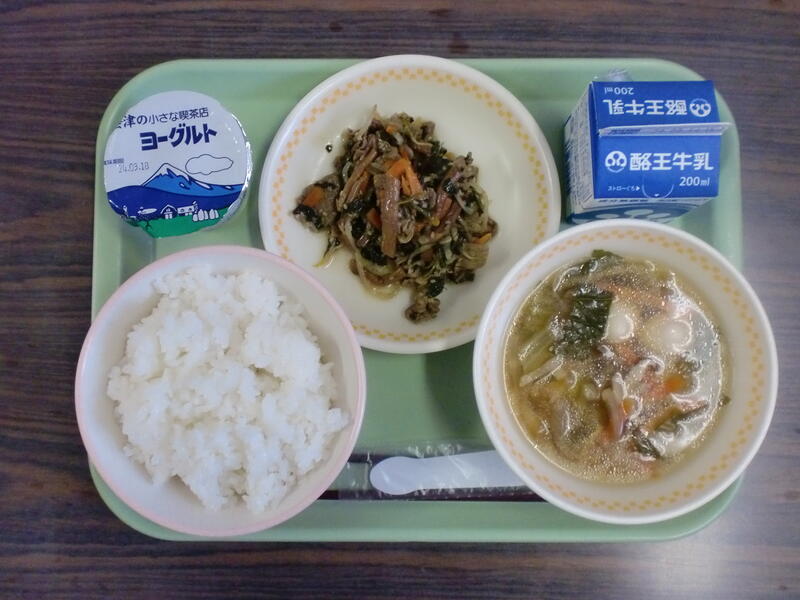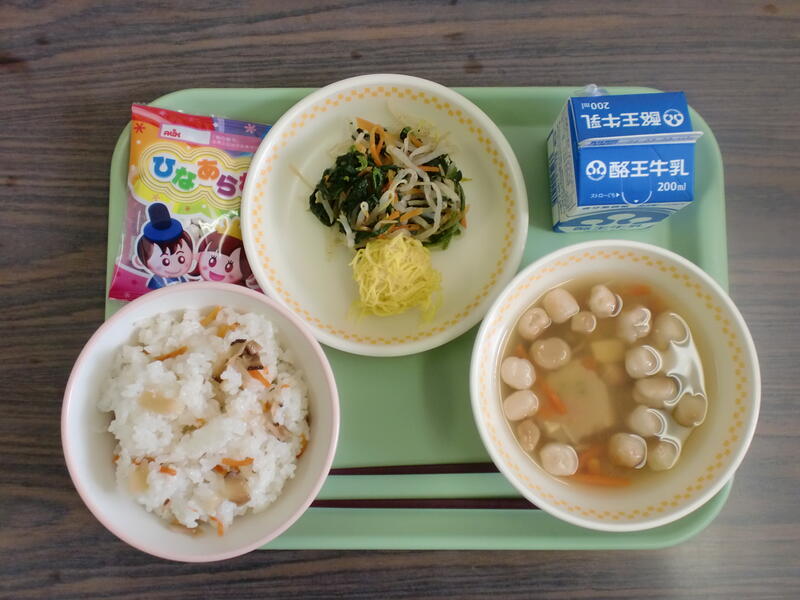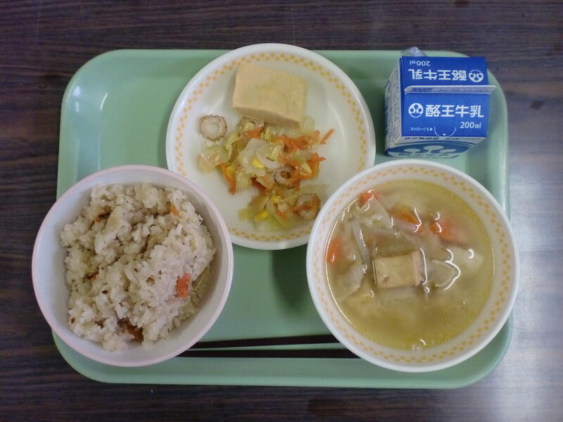 今日は、荒井小学校6年生が学級活動の時間に考えてくれた献立です。ポイントは「旬の野菜を入れ、主食を味ごはんにしたので主菜は塩分の少ないだし巻きたまごにしたこと」だそうです。