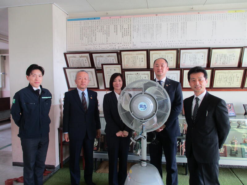 佐藤工業の取締役副社長様と営業部・経理部の代表の方、そして扇風機を製造している「ミドリ安全」の担当の方、合わせて4名が本校においでになり、寄贈していただきました。