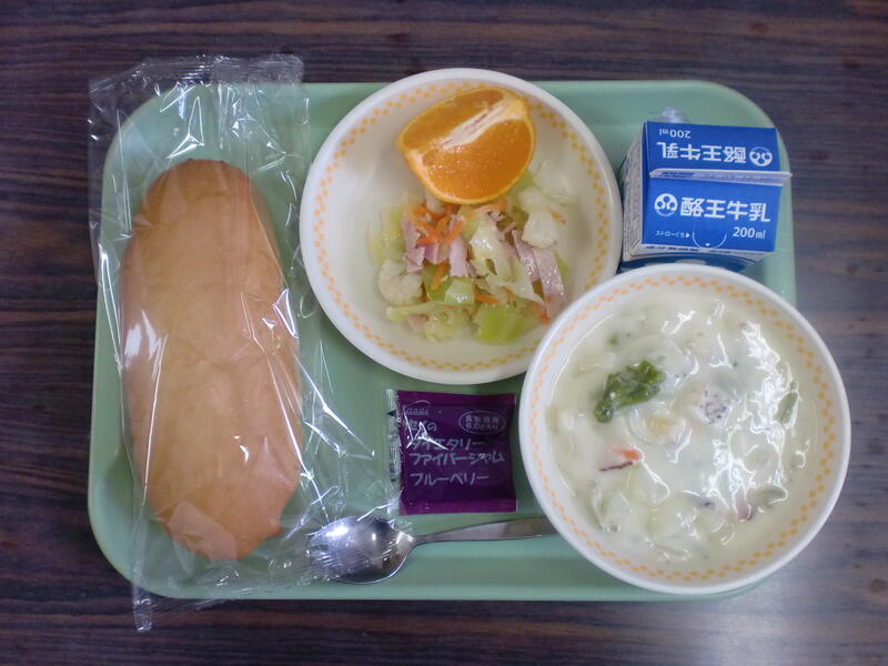 コッペパン ブルーベリージャム 鯛と菜の花のクリーム煮 カリフラワーサラダ せとか です。