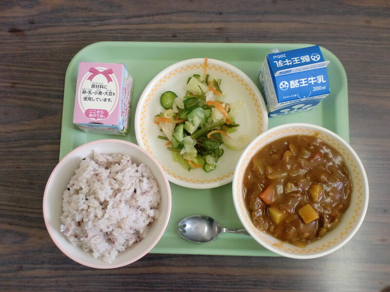 七穀ごはん ビーフカレー 茎わかめサラダ いちごケーキ です。