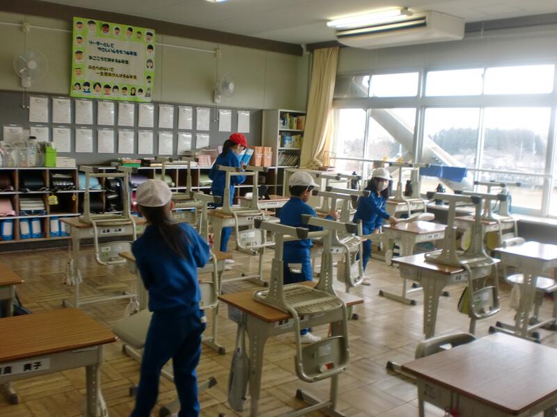 いよいよ来週で3学期が終わります。今日はワックスがけのために、縦割り班でそれぞれ大掃除をしました。子どもたちは1年間お世話になった教室に感謝の気持ちを込めて、ピカピカにしていました。