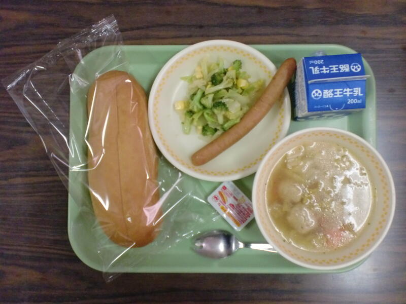 切れ目入りコッペパン 白菜と肉団子のスープ フランクフルト ケチャップ&マスタード ブロッコリーサラダ