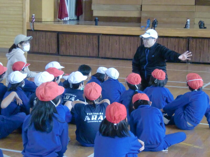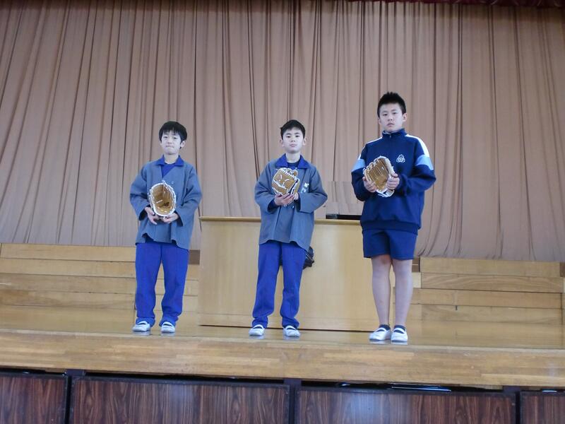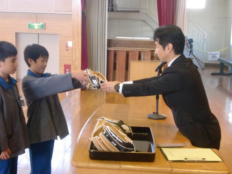 本日、あらいっ子タイムで、大谷選手から送られたグローブを全校生にお披露目しました。代表の6年生に贈呈した後、何人かでキャッチボールを行いました。
