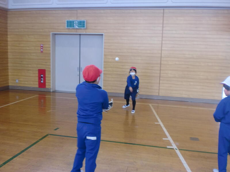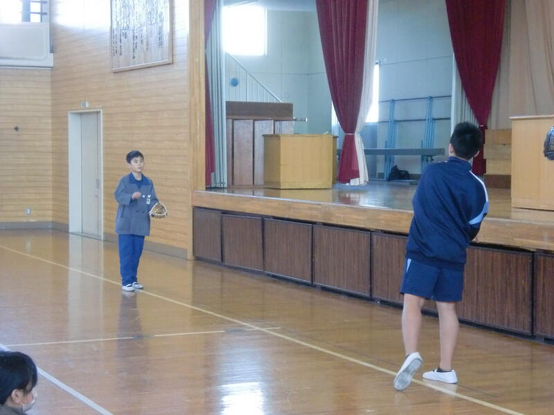 先週の水曜日に大谷翔平選手から送られたグローブをお披露目して以来、各学年でさっそくグローブを使って遊んでいます。今日は、1年生が体育の時間になわとびと平行してキャッチボールを楽しんでいました。