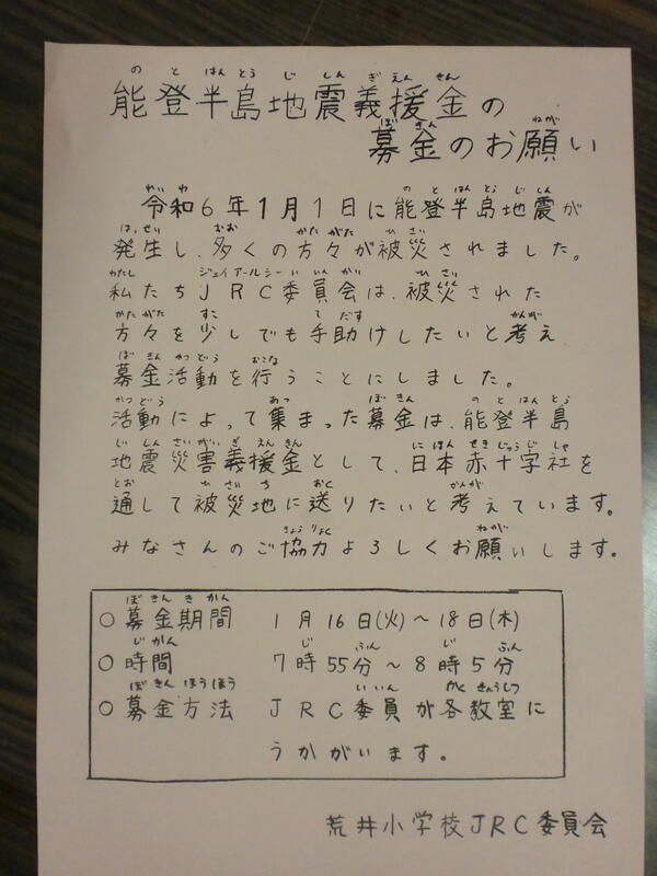 16日(火)から本日までの3日間、「能登半島沖地震」で被害にあわれた方々を支援するための募金活動を行いました。JRC委員会が、朝各教室を周り、募金を呼びかけたところ、3日間で57,165円集まりました。この善意がつまったお金は、日本赤十字社を通して被災地に届けられます。荒井小学校のみなさん、ありがとうございました。