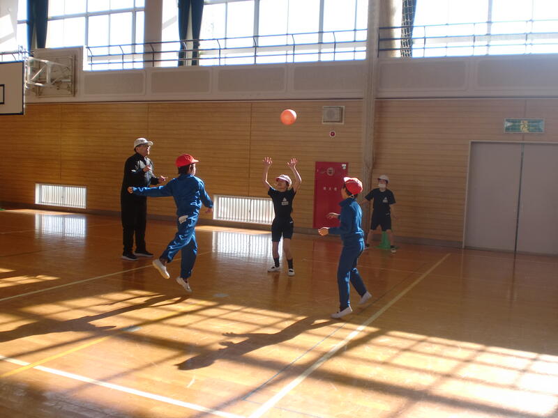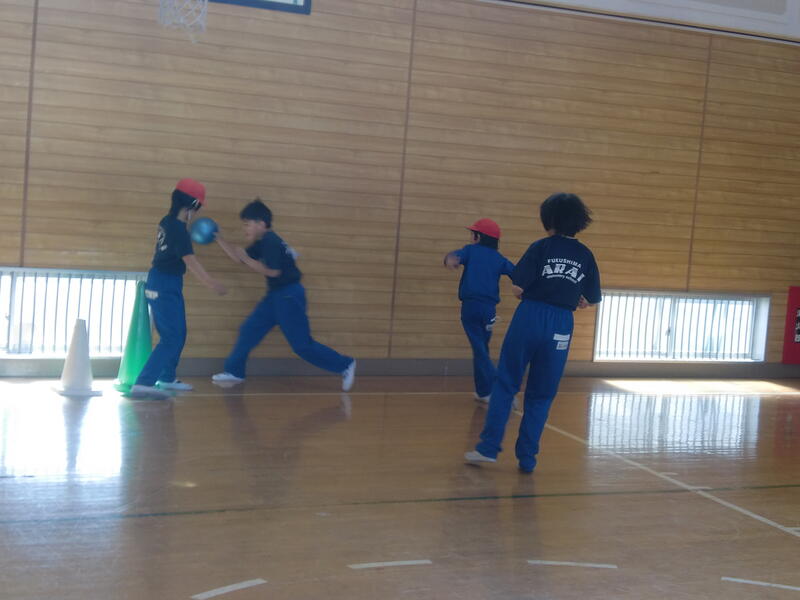 今日は、先生から簡単なルールの説明の後、2対2に分かれてのシュートゲームを行いました。最初は、ボールを持ったらすぐにシュートすることに意識が向きがちでしたが、後半になるとフェイントをかけたり、パスを回したりと、少しずつ上手にできるようになってきました。みんな楽しそうに笑顔でゲームに熱中していました。