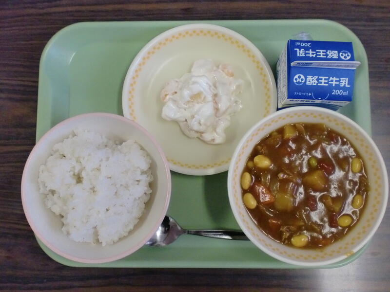 麦ごはん 豆カレー フルーツヨーグルトあえ です。おいしくいただきました