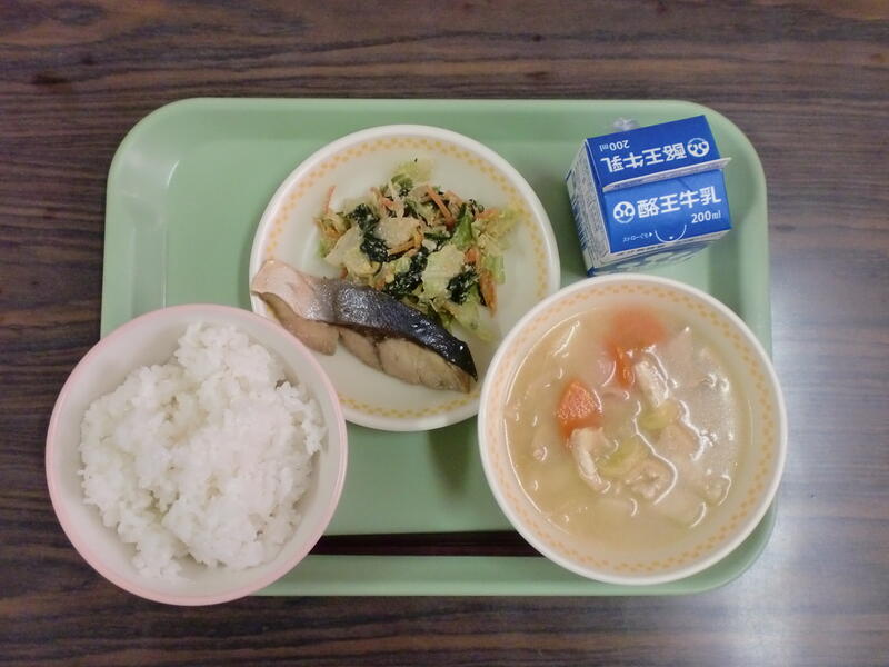 ご飯 野菜のかす汁 ぶりの照り焼き 小松菜のごまあえ です。おいしくいただきました。