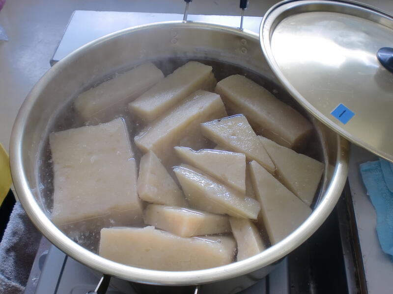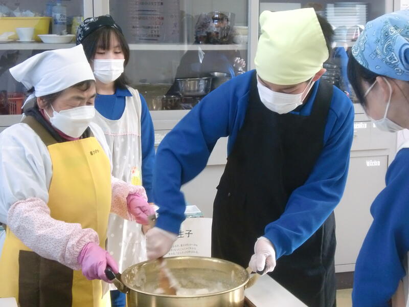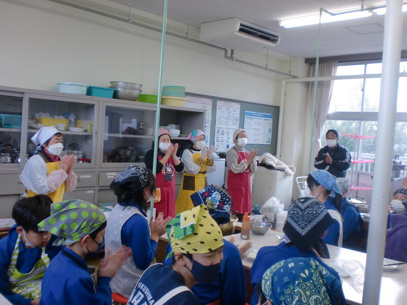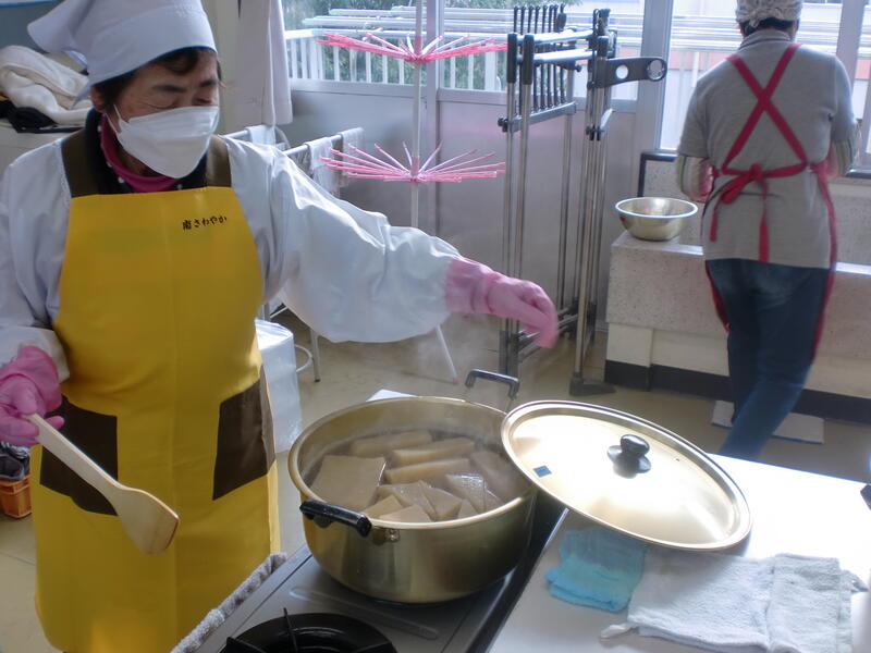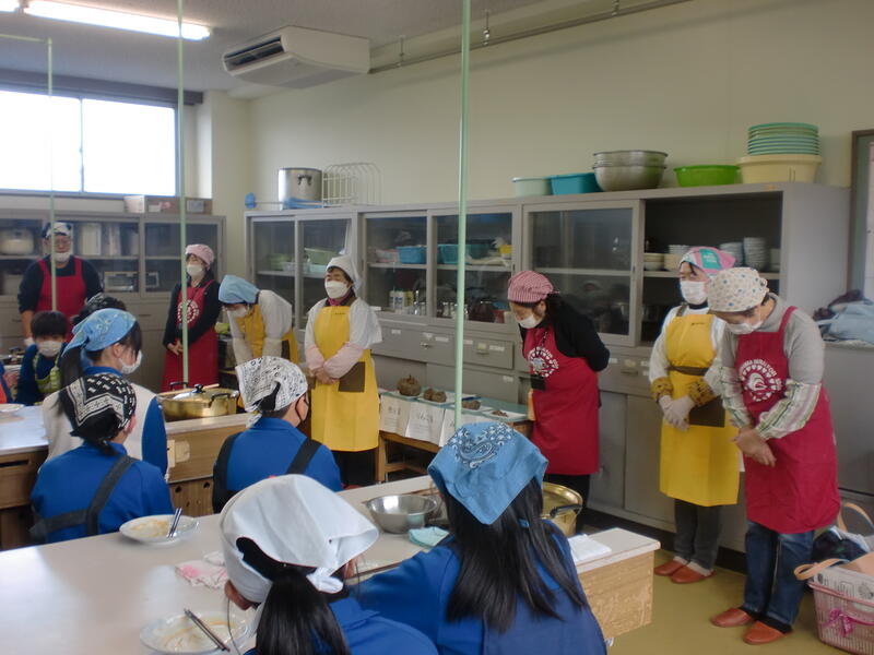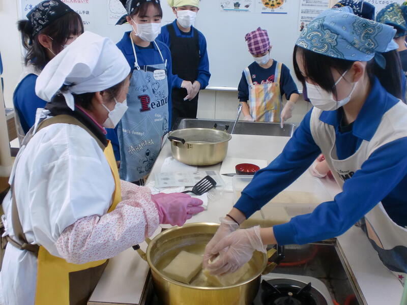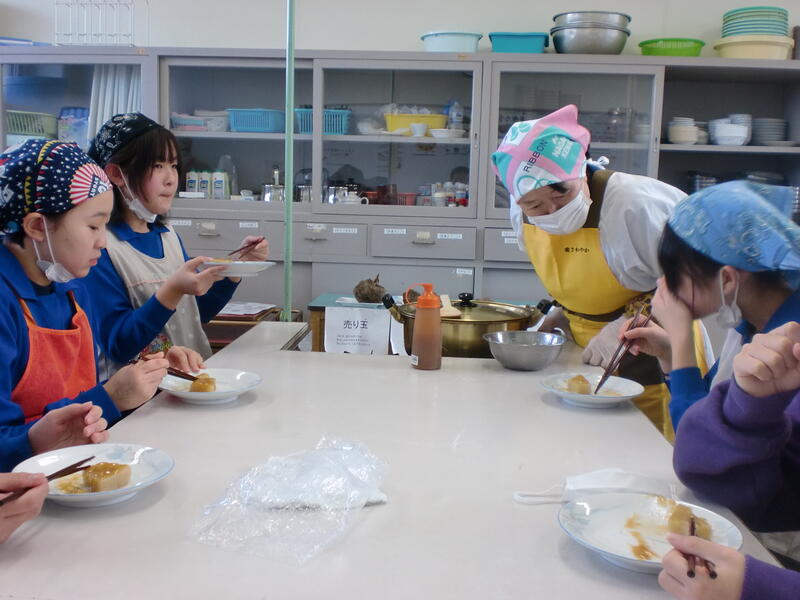 6年生は、2・3校時、JAみらいふくしまの婦人部のみなさんをお招きして、こんにゃく作りに挑戦しました。スーパーで買うこんにゃくが、こんにゃく芋からできることも初めて知り、みんな興味津々に取り組みました。できあがったこんにゃくは、甘味噌をかけてさっそく試食。手作りの食感と味噌のうまみがマッチしたおいしさに、子どもたちは満足していました。