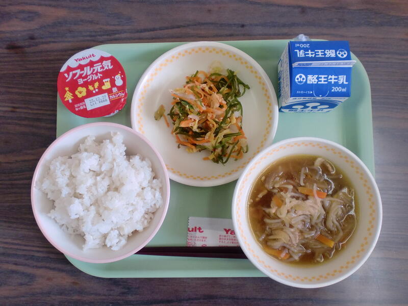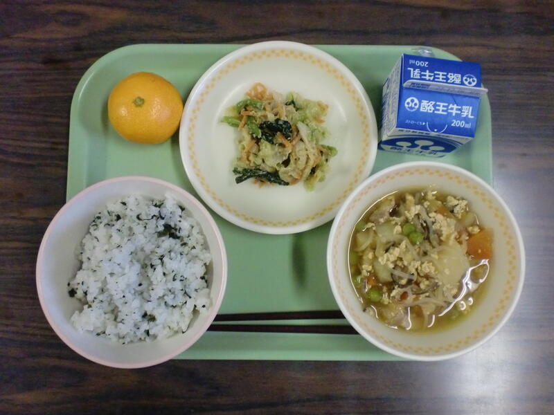 わかめごはん 親子煮 ごまあえ みかん です。おいしくいただきました。