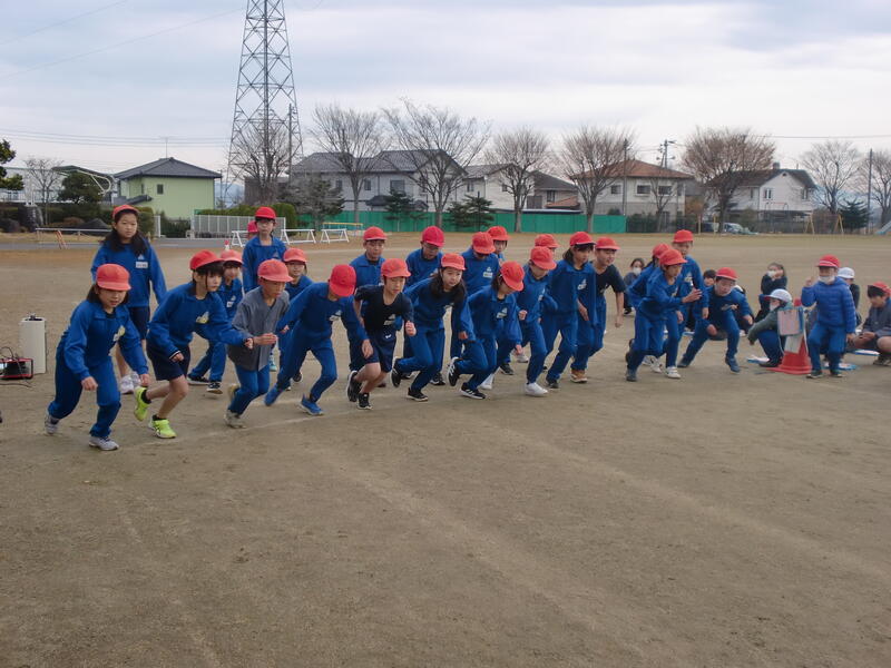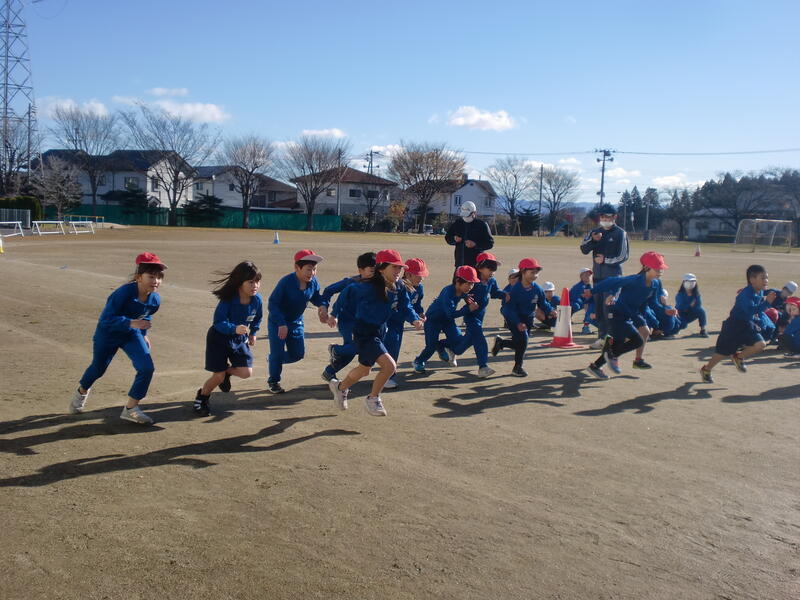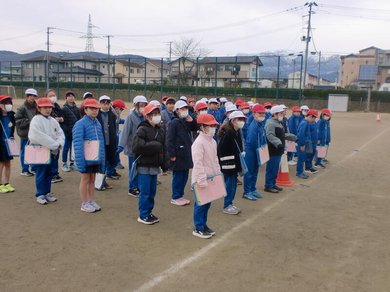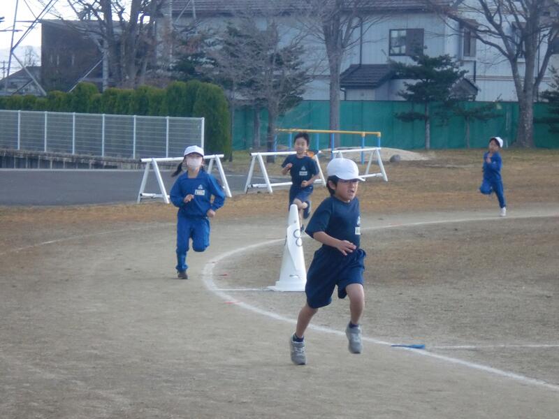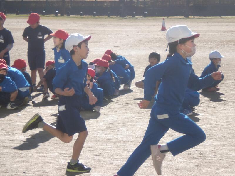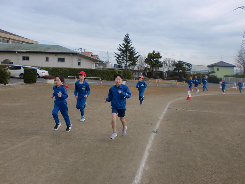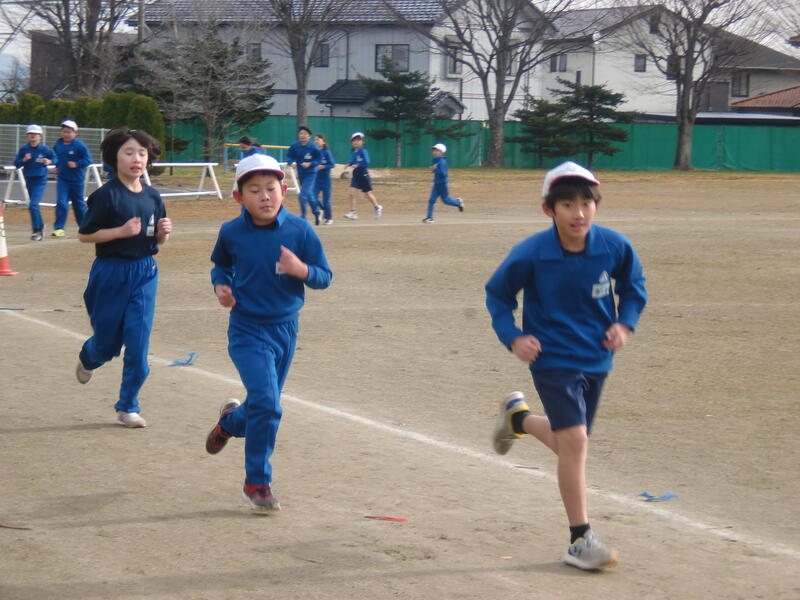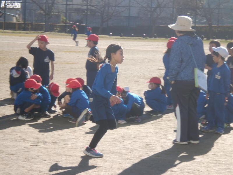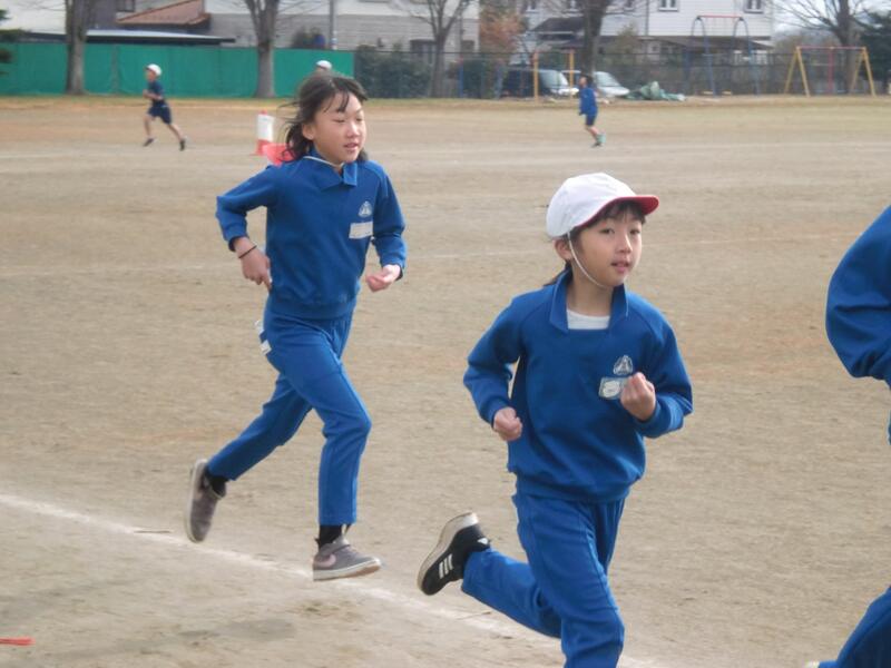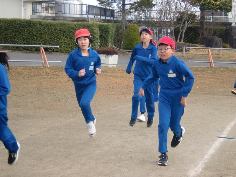 昨日とはうってかわって寒さの厳しい中、中学年の持久走記録会が行われました。低学年より1分多い4分間の間に何m走れたかを記録します。寒さに負けず、精一杯走りきることができました。
