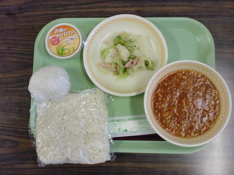 ソフトめん 大豆入りミートソース 花野菜サラダ お米のみかんババロア です。ごちそうさまでした