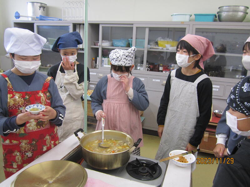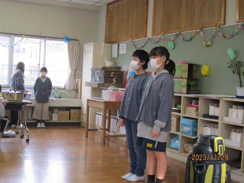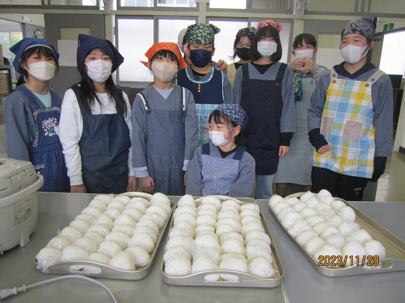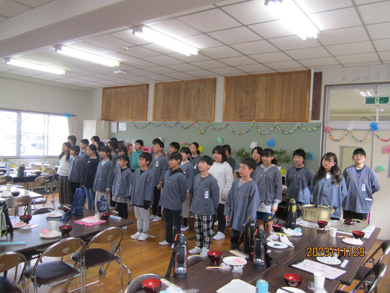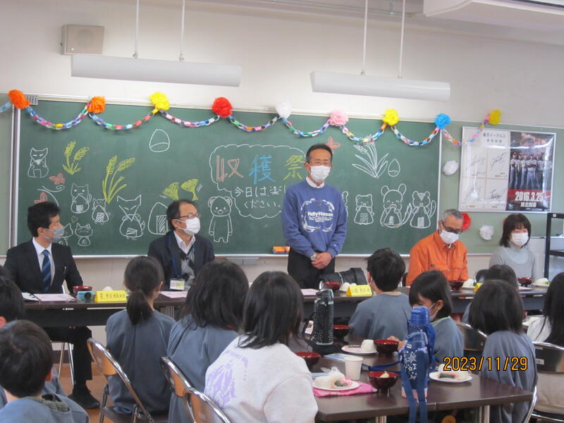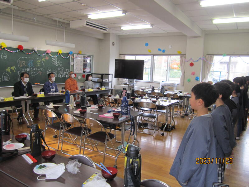 今日は待ちに待った収穫祭の日。5年生は、朝から豚汁とおにぎりつくりに盛り上がっていました。準備も整い、校長先生をはじめ、これまでお世話になった方々をお招きしていよいよ開催。
