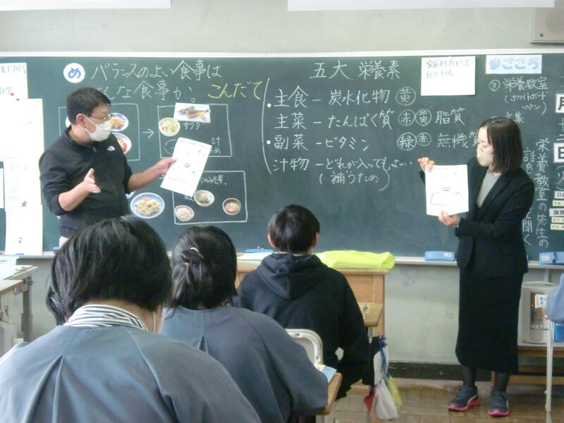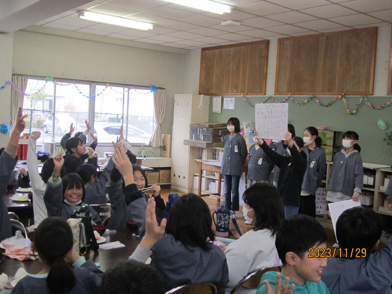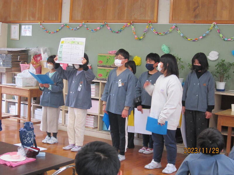 始めに、「ラーメン、唐揚げ、フライドポテト、ごはん」といった、食べてみたいけど、栄養に偏りがあるメニューから「バランスの良い食事はどんな食事だろう」というテーマで、子どもたちに献立を考えてもらいました。さらに「旬」の食べ物を取り入れ「タンパク質」「炭水化物」「脂質」「ビタミン」「無機質」の5大栄養素を組み合わせてバランスの良い献立を考える事ができました。子どもたちが考えた献立の中から1つ、3月の給食のメニューに採用されます。楽しみですね。