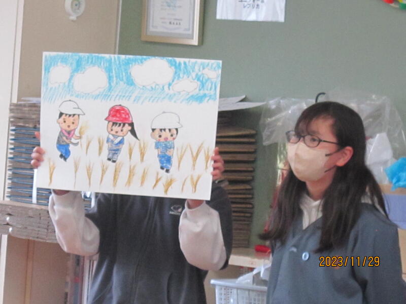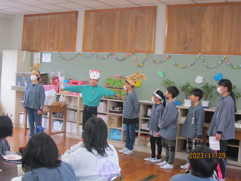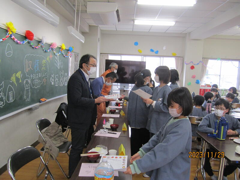 おにぎりは味付け無しでもお米の味で十分おいしかったです。キュウリの塩漬けと豚汁で、子どもたちもあっという間に食べてしまいました。そして、グループごとに稲作りについてのクイズを出したり、劇を行ったり、全員で歌を歌ったりと、楽しい時間を過ごしました。最後に、お招きした方々に、感謝状を贈り、収穫祭は大成功でした。5年生のみなさん、お疲れ様でした。