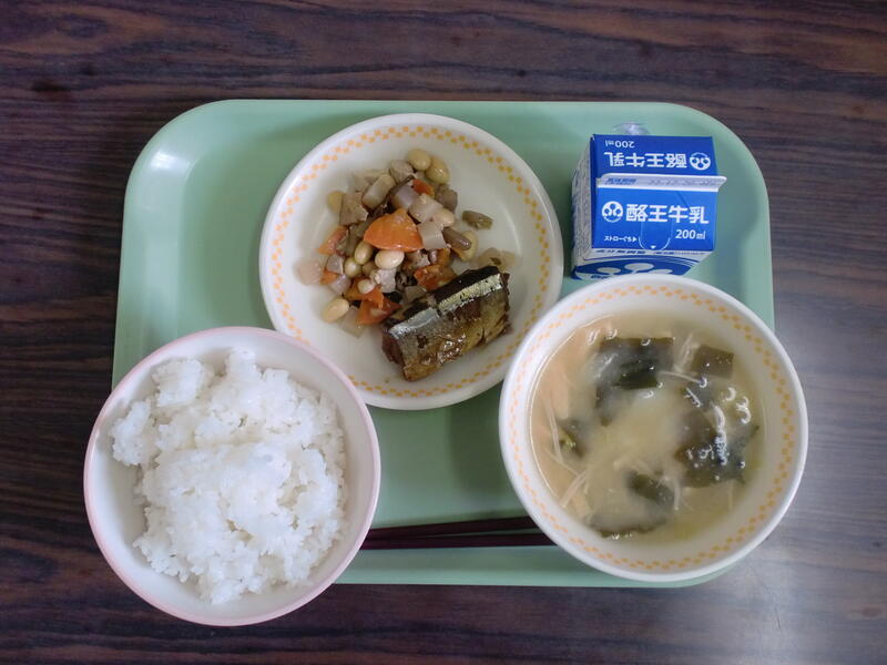 ご飯 わかめ汁 さんまの生姜煮 五目豆 です。おいしくいただきました。