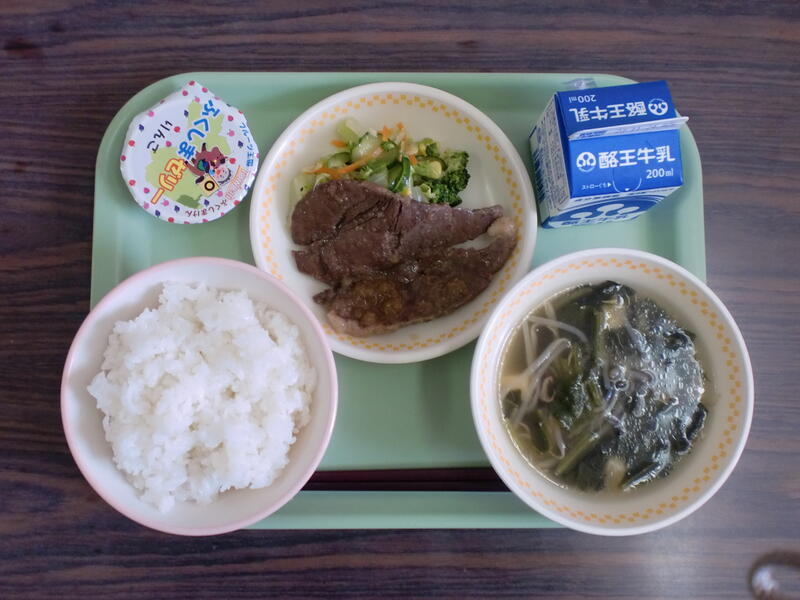 ご飯 五目スープ 県産牛ステーキおろしソースかけ 県産ブロッコリーサラダ 県産りんごゼリーです。