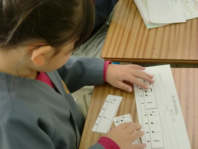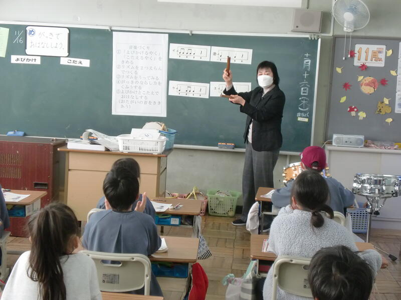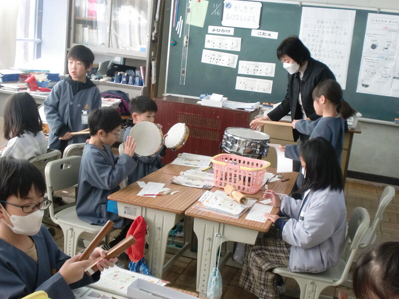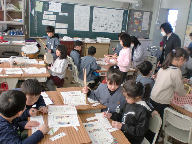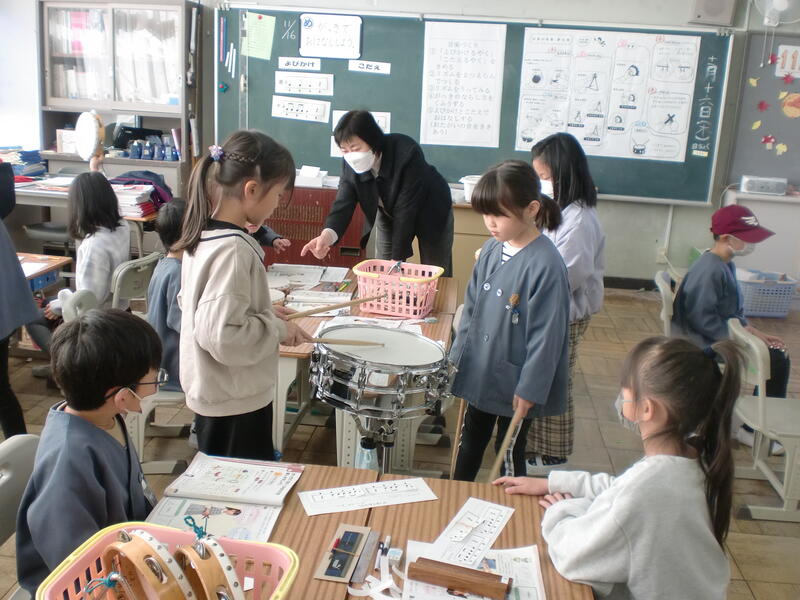 昨日、2年生の音楽科の研究授業が行われました。題名は「がっきでおはなし」。「よびかけ」役と「こたえ」役に分かれ、よびかけのリズムに対して、別のリズムでこたえるというリズム感を養う授業です。子どもたちは、4つのリズムの中から好きなものを2つ選び、好きな打楽器を使って思い思いにリズムを表現することができました。