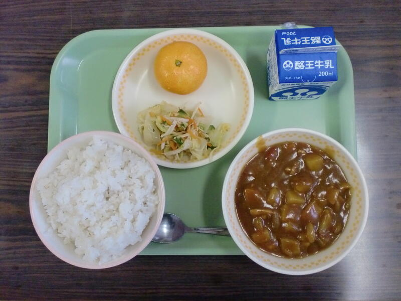 麦ごはん ポークカレー さきいかサラダ みかん です。 ごちそうさまでした。