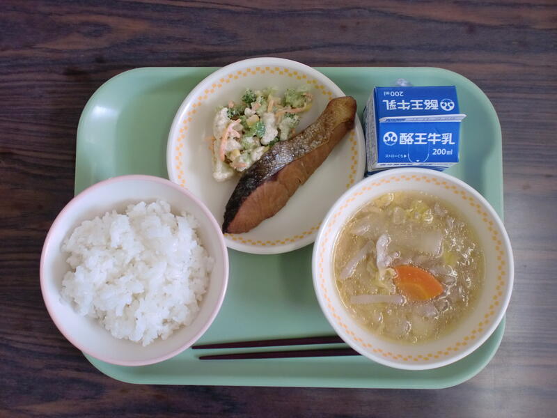 ごはん 芋煮汁 鮭の照り焼き ごまねーずサラダ です。寒い季節にはアツアツの芋煮汁は最高ですね。ごちそうさまでした