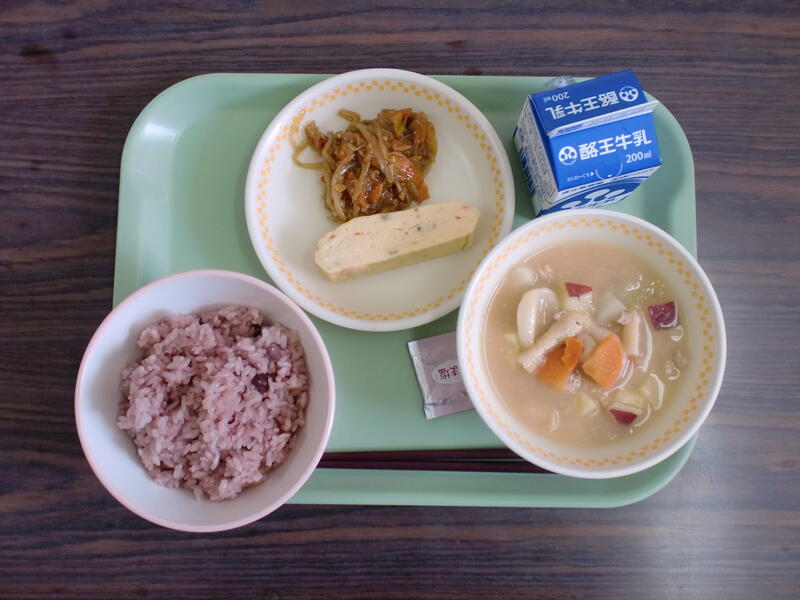 赤飯 パックごま塩 すいとん汁 五目たまご焼き 切干大根のカレー炒め です。ごちそうさまでした