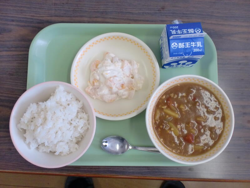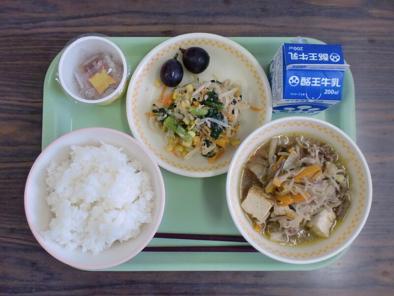 麦ごはん 豆とひき肉のカレー フルーツヨーグルトあえ おいしくいただきました