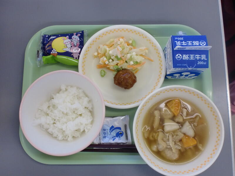 ごはん 魚ふりかけ 月見団子 月見汁 枝豆とチーズのサラダ でした。ごちそうさまでした