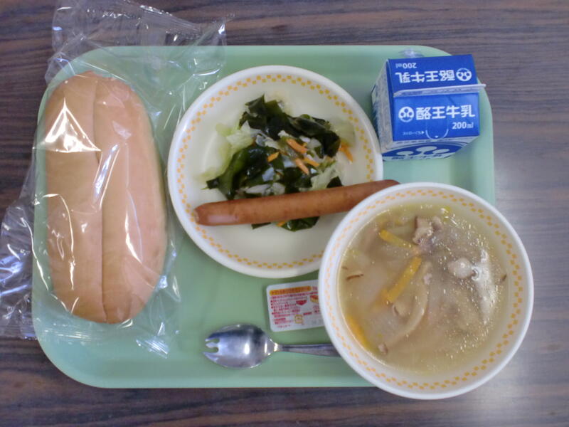 切れ目入米粉パン きのこスープ わかめサラダ フランクフルト ケチャップ&マスタード です。