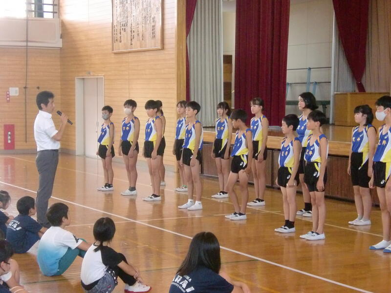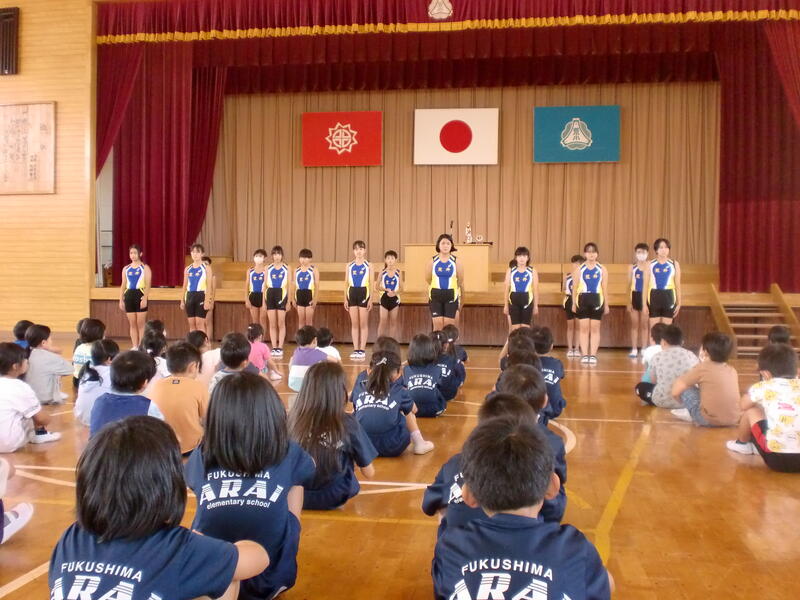 お昼のあらいっ子タイムは、10月4日(水)に行われる福島市小学校体育大会陸上競技大会に出場する選手のみなさんへの壮行会を行いました。