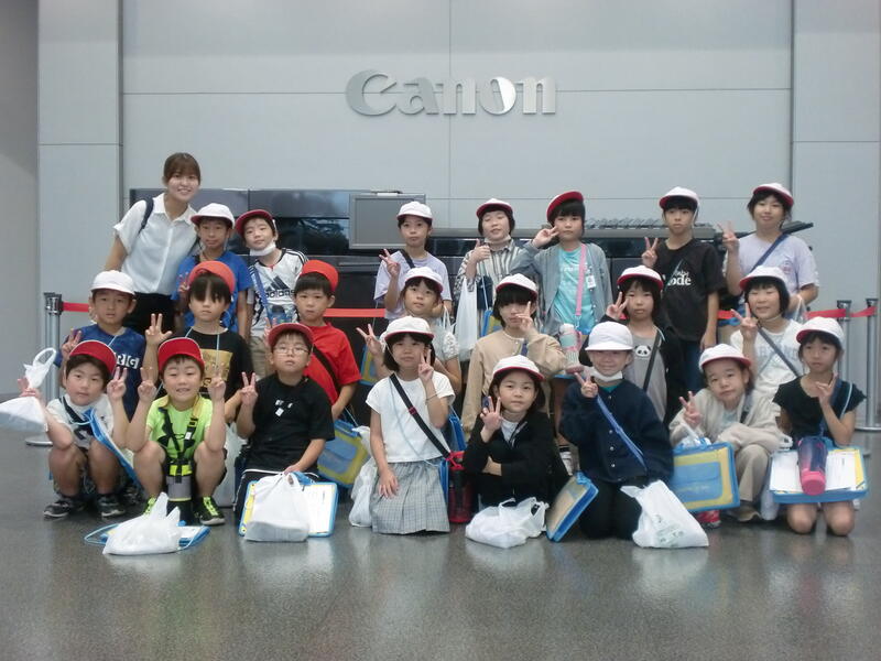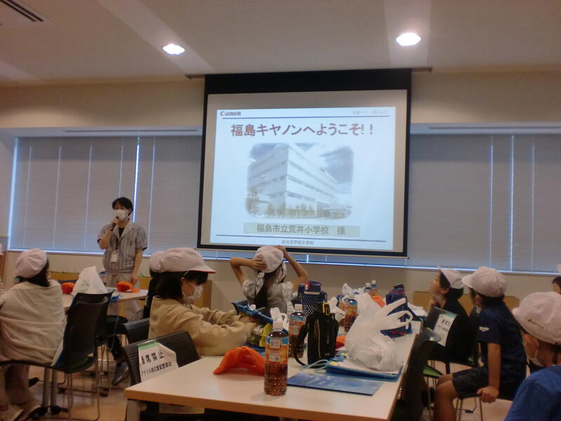 本日、3年生が社会の学習で佐倉にある福島Canon株式会社の工場へ見学に行きました。ここでは、インクジェットプリンター用のインクタンクやプリントヘッドを主に作っています。はじめに玄関で記念撮影をした後、1600人が一度に食べられる食堂に案内されて、そこで係の方から自己紹介と工場についての説明を聞きました。
