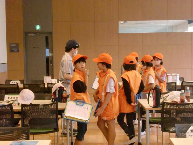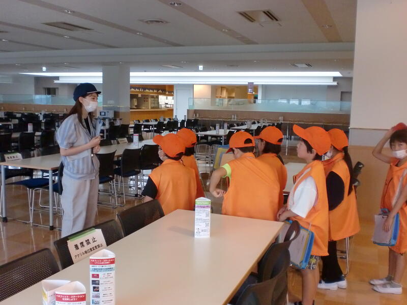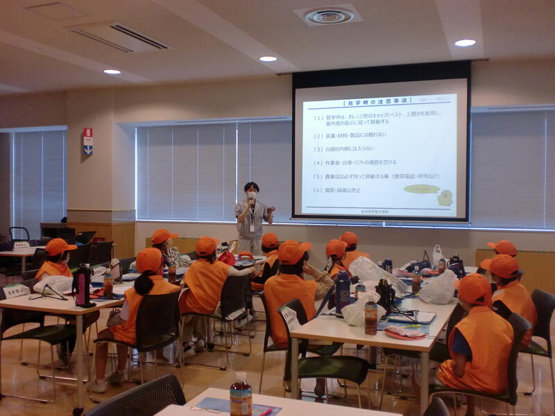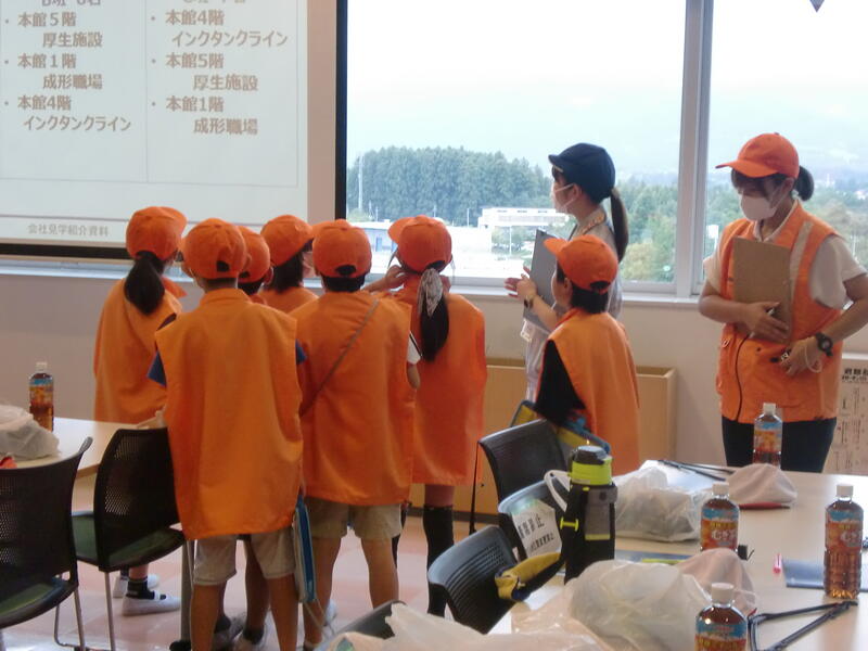 紹介DVDを見た後は、いよいよ工場見学です。みんなオレンジの帽子とベストを着て3つのグループに分かれました。そして案内役のお兄さんやお姉さんと一緒にインクタンクを作っている工場の中に入り、説明を受けました。荒井小学校の2~3倍くらい広い工場の中は、インクタンクを作る大きな機械がたくさんありました。その機械が規則正しくインクタンクを作る様子を子どもたちは興味津々に見ることができました。